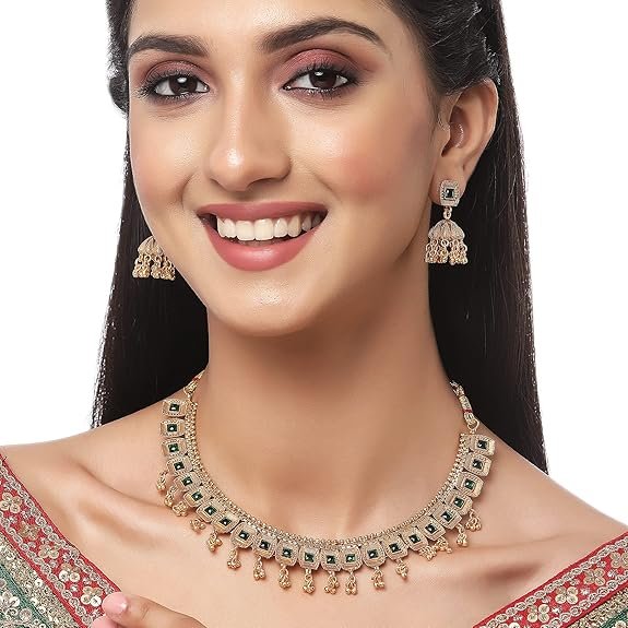 Antique Gold-Plated Artificial Stone Studded Necklace with Earrings Jewellery Set