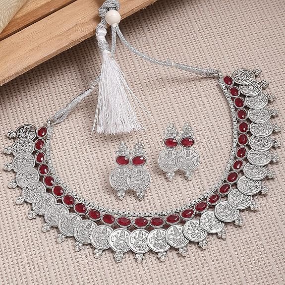 Antique Oxidised Silver Plated Traditional Temple Coin Red American Diamond Studded Necklace With Earrings