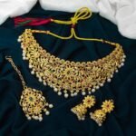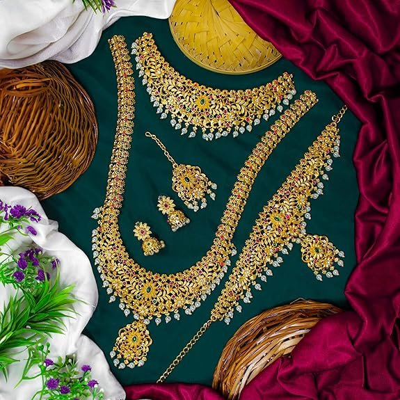 • Complete Bridal Jewelry Set: Includes a necklace, earrings, maang tikka, and adjustable vaddanam for a coordinated look.