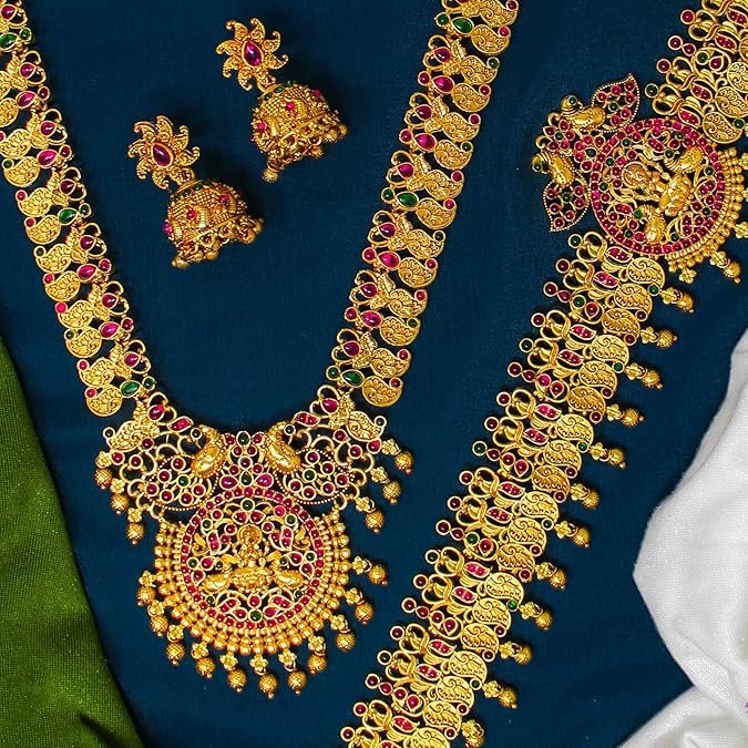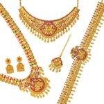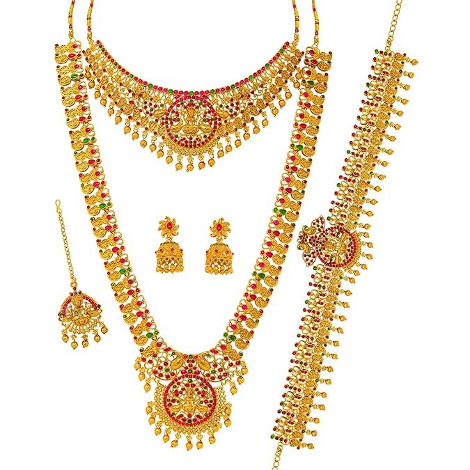 About this item Complete Bridal Jewelry Set: Includes a necklace, earrings, maang tikka, and adjustable vaddanam for a coordinated look.