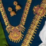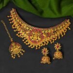 Celebrate your special day with this Gold-Plated Bridal Jewelry Set, featuring a majestic Temple Lakshmi design. This traditional set includes a necklace, earrings, maang tikka, and a beautifully crafted vaddanam (waist belt) — all adorned with divine detailing and cultural richness. Perfect for South Indian bridal looks and grand festive occasions.